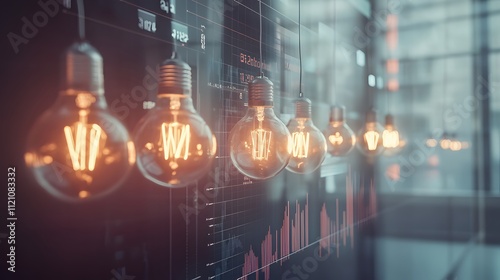 A sleek arrangement of lightbulbs, calendar icons, and financial graphs for innovation in time management. White background. No shadow