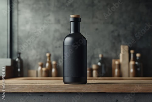 A sleek black bottle with a cork stopper placed on a wooden counter in a modern kitchen setting