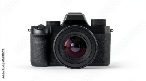 A sleek black camera with a prominent lens, designed for photography enthusiasts, featuring textured grips and modern controls.
