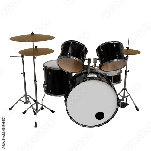 A sleek, black drum kit with three tom-toms, a bass drum, a snare drum, and two cymbals, all mounted on chrome stands against