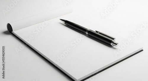 A sleek black pen rests on a blank white notepad against a clean white backdrop in monochrome style