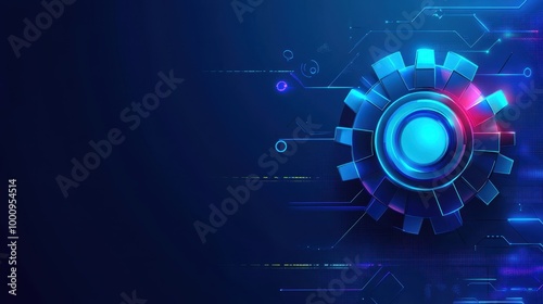 A sleek blue gradient background featuring a prominent gear and neon elements, representing the connection between technology and science.