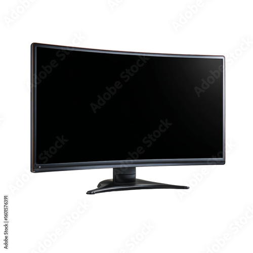A sleek curved monitor, displaying a blank black screen