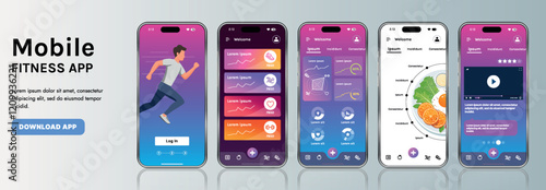A sleek fitness app interface template featuring responsive design elements, including dashboards, charts, and statistics. Perfect for tracking health, weekly progress, and sports activities