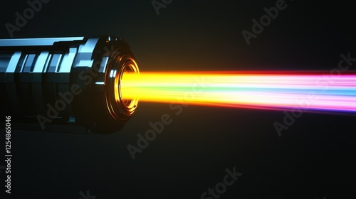 A sleek futuristic device producing a powerful rainbow-colored light beam, contrasting vividly against a black backdrop.