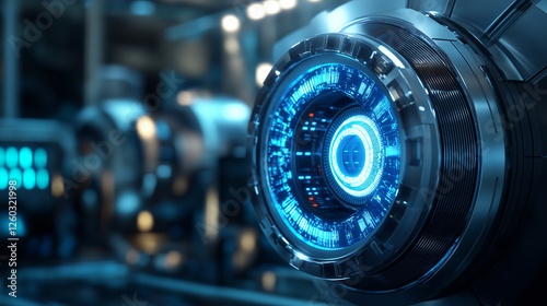 A sleek, futuristic generator, glowing with blue LED indicators, placed in an advanced research facility specializing in energy-efficient industrial machinery.