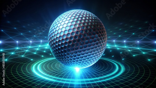 A sleek, futuristic golf ball with metallic finish and neon blue circuits, suspended in mid-air, surrounded by a subtle, futuristic grid pattern in a dark background.