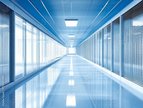 A sleek, futuristic hallway with an ultra-modern glass and metal design. The corridor is illuminated by natural light streaming through large floor-to-ceiling windows, creating a sense of openness