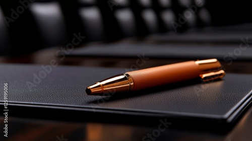 A sleek, gold-accented pen rests on a dark surface, suggesting a professional setting or meeting environment.