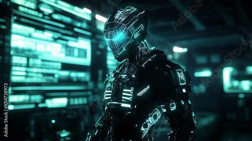 A sleek humanoid figure in a neon-lit futuristic environment surrounded by advanced technology background