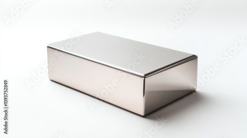 A sleek, metallic box with a reflective surface, showing light reflections against the white background