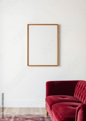 A sleek minimalist poster mockup hangs majestically on a pristine white wall its frame subtly accented with a touch of gold A plush sofa its velvet upholstery a rich burgundy invites viewers to sink i