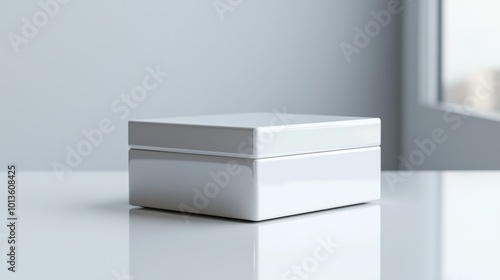 A sleek, minimalist white box with a clean design sits on a glossy surface, reflecting modern simplicity and elegance.