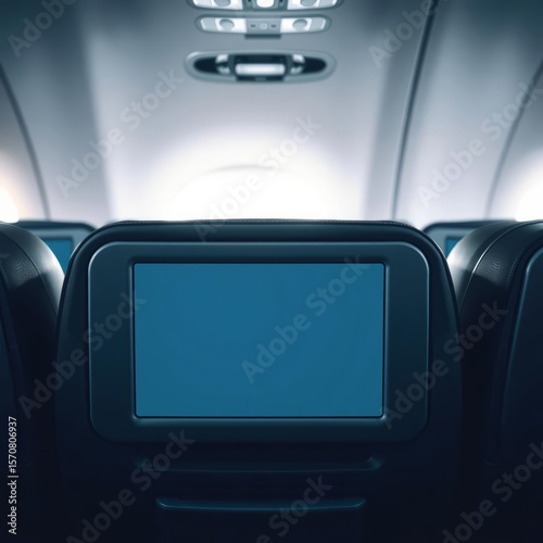 A sleek minimalist white monitor screen mirroring the pristine interior of an airplane sits blankly on a plush passenger seat ready to be filled with the magic of flight and endless entertainment pro