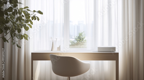 A sleek, modern desk in front of a bright window with sheer curtains, accompanied by a simple chair. The workspace is organized and clutter-free, emphasizing natural light