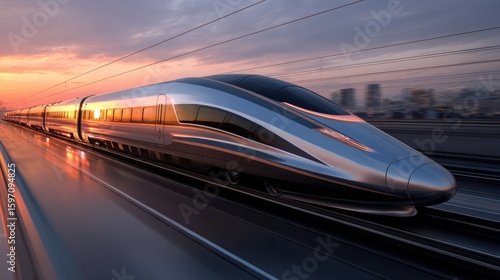 A sleek modern high speed train races through a stunning golden sunset showcasing the advanced technology and infrastructure of efficient transportation