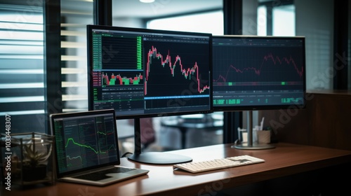 A sleek, modern office setup features dual monitors displaying financial graphs, a laptop, and a tidy wooden desk, exuding productivity and focus.
