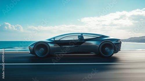 A sleek modern sports car driving on a coastal road with the ocean in the background under a bright sky.