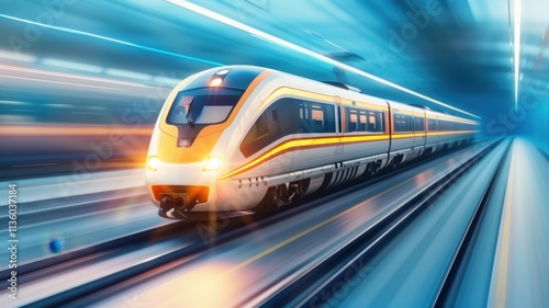 A sleek, modern train speeds through a vibrant tunnel, showcasing dynamic motion and advanced technology.