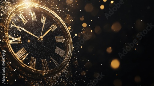 A sleek New Years Eve advertisement banner with a simple countdown clock and glittering gold accents on a black background, offering ample space for text, designed for modern digital campaigns