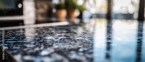 A sleek, polished countertop reflects soft light, creating an elegant and modern kitchen atmosphere highlighted by blurred greenery in the background.