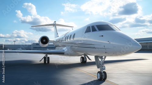 A sleek private jet parked at an airport under a blue sky with scattered clouds.