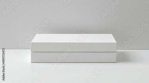 A sleek rectangular white box with rounded corners, resting neatly on a glossy white surface