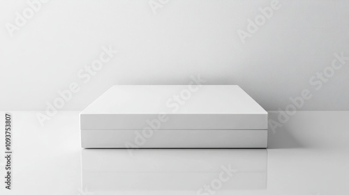 A sleek rectangular white box with rounded corners, resting neatly on a glossy white surface