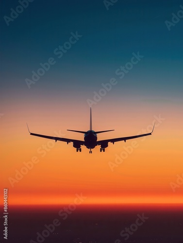 A sleek silhouette of an airplane flying through the sky during a vibrant sunset. Generative AI