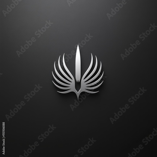 A sleek, silver emblem featuring stylized wings and a pointed design.