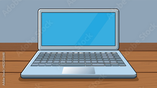 A sleek silver laptop rests on a wooden desk its keyboard and screen illuminated by a soft blue light. The edges are slightly curved giving it a. Cartoon Vector.
