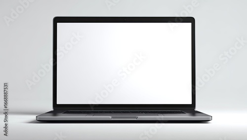 A sleek, silver laptop with a blank white screen sits on a plain white background, showcasing its minimalist design