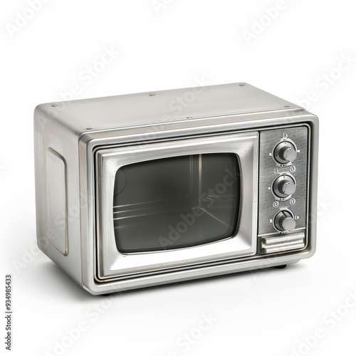 A sleek silver microwave oven with a classic design, isolated on a white background. The microwave has a glass door and three knobs on the front.
