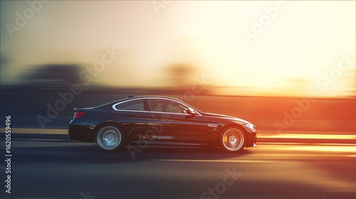 A sleek sports car in motion, showcasing speed and dynamic lighting on a simple road.
