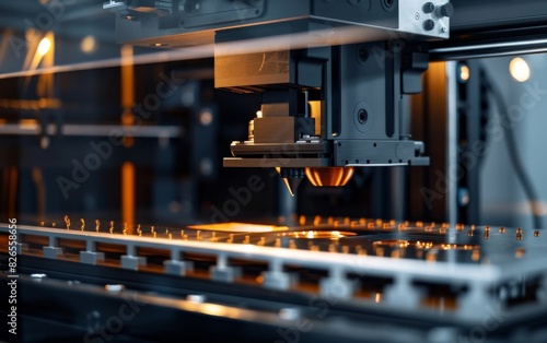 A sleek, state-of-the-art 3D printer producing intricate metal parts with mesmerizing precision and detail