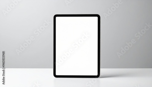 A sleek tablet with a blank screen sits on a minimalist surface, showcasing modern technology against a soft gray background
