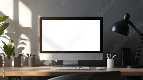 A sleek, uncluttered workspace setup, featuring a contemporary computer monitor on a wooden desk. Sunlight casts striking shadows.