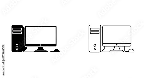 A sleek vector illustration of a desktop computer setup, featuring a monitor, tower, keyboard, and mouse, presented in a minimalist black and white style.