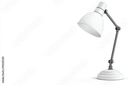 A sleek, white desk lamp with an adjustable arm, set against a minimalistic white background, ideal for modern workspaces.
