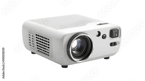 A sleek white projector with a modern design, showcasing its lens and control panel.