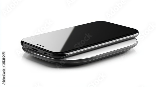 A sleek wireless charger with a phone on top, placed on a clean white surface, on a white isolated background