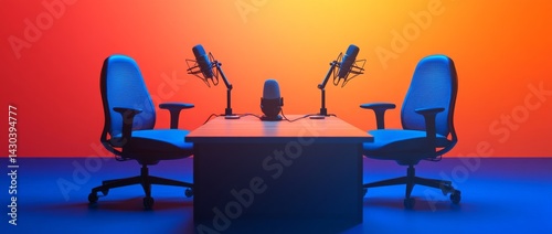 A sleek wooden desk sits in a brightly lit conference room, accompanied by two modern office chairs and two professional microphones on stands, all isolated on a white background