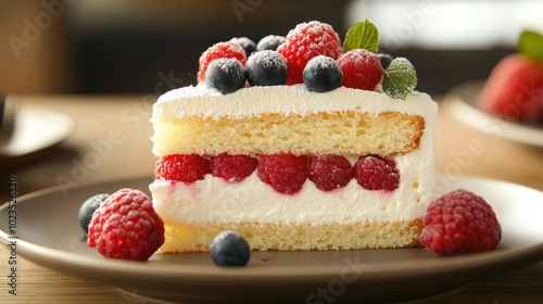 A Slice of Cake Decorated with Raspberries and Blueberries