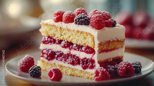 A slice of cake with layers filled and topped with raspberries, surrounded by blackberries on the plate.
