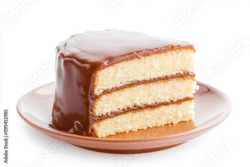 A slice of cake with three layers, covered in a glossy chocolate ganache, served on a brown plate. The cake has a light yellow sponge and rich chocolate filling.