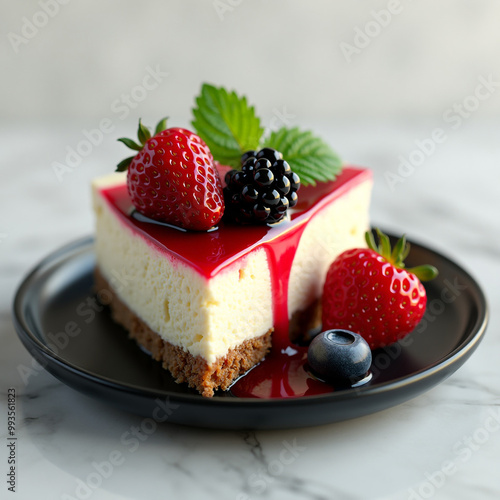 A slice of cheesecake with berries and raspberries on a plate with mint leaf