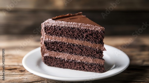 A slice of chocolate cake on a white plate with a contrasting wooden background, making the chocolate layers and frosting pop.
