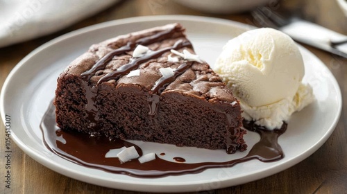 A slice of chocolate cake topped with ice cream and drizzled with chocolate sauce.