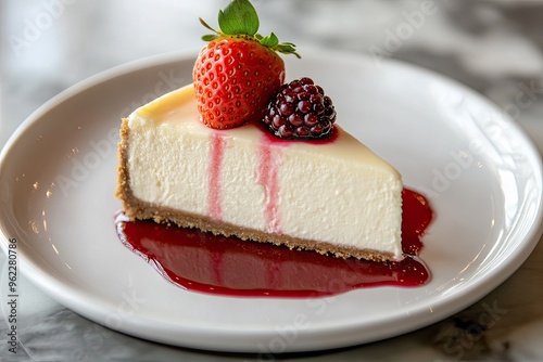 A slice of classic New York cheesecake on a simple white plate, topped with a single strawberry and a drizzle of berry sauce