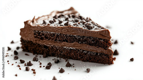 A slice of decadent chocolate cake with rich frosting and a sprinkle of powdered sugar, showcasing its indulgence, isolated on a white background.